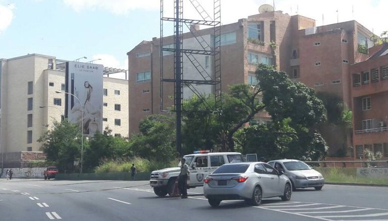 Se puede observar una patrulla de la policía impidiendo el paso hacia La Trinidad. La Mesa de la Unidad Democrática había anunciado un trancazo el pasado jueves que se extendió hasta este sábado y tenía previsto que durara hasta las 12:00pm.
