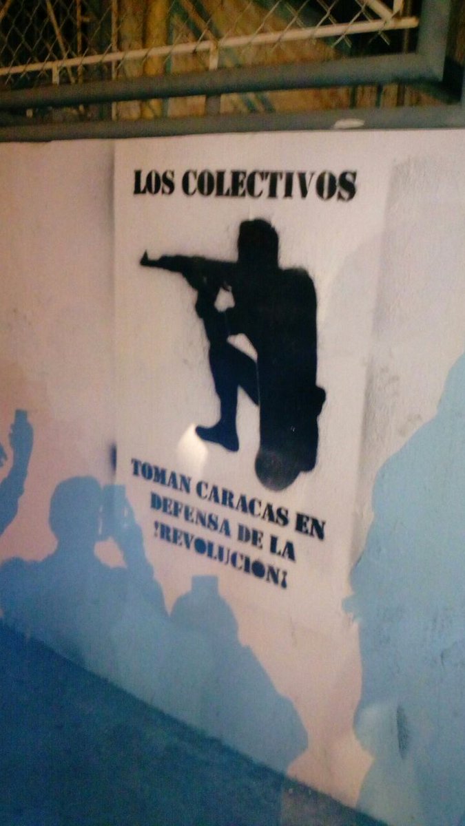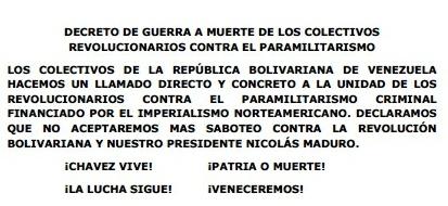 El texto lee lo siguiente: “decreto de guerra a muerte de los colectivos revolucionarios contra el paramilitarismo: Los colectivos de la República Bolivariana de Venezuela hacemos un llamado directo y concreto a la unidad de los revolucionarios contra el paramilitarismo criminal, financiado por el imperialismo norteamericano. Declaramos que no aceptaremos más saboteo contra la revolución”.
