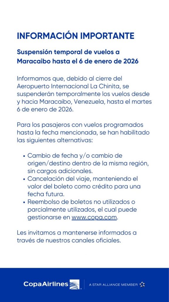 «Copa Airlines informa que, debido al cierre del Aeropuerto Internacional La Chinita, en Maracaibo, Venezuela, suspenderá temporalmente sus vuelos hacia y desde esta ciudad hasta el martes 6 de enero de 2026″, indicó un breve comunicado de la aerolínea de bandera panameña.