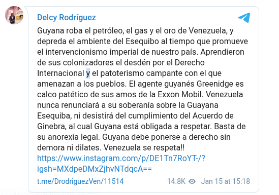 “Basta de su anorexia legal. Guyana debe ponerse a derecho sin demora ni dilación. ¡Venezuela se respeta!», escribió en sus redes sociales la alta funcionaria ante el las declaraciones de Carl Greenidge, agente de Guyana ante la Corte Internacional de Justicia (CIJ) en la controversia con Venezuela por el territorio de Esequibo.