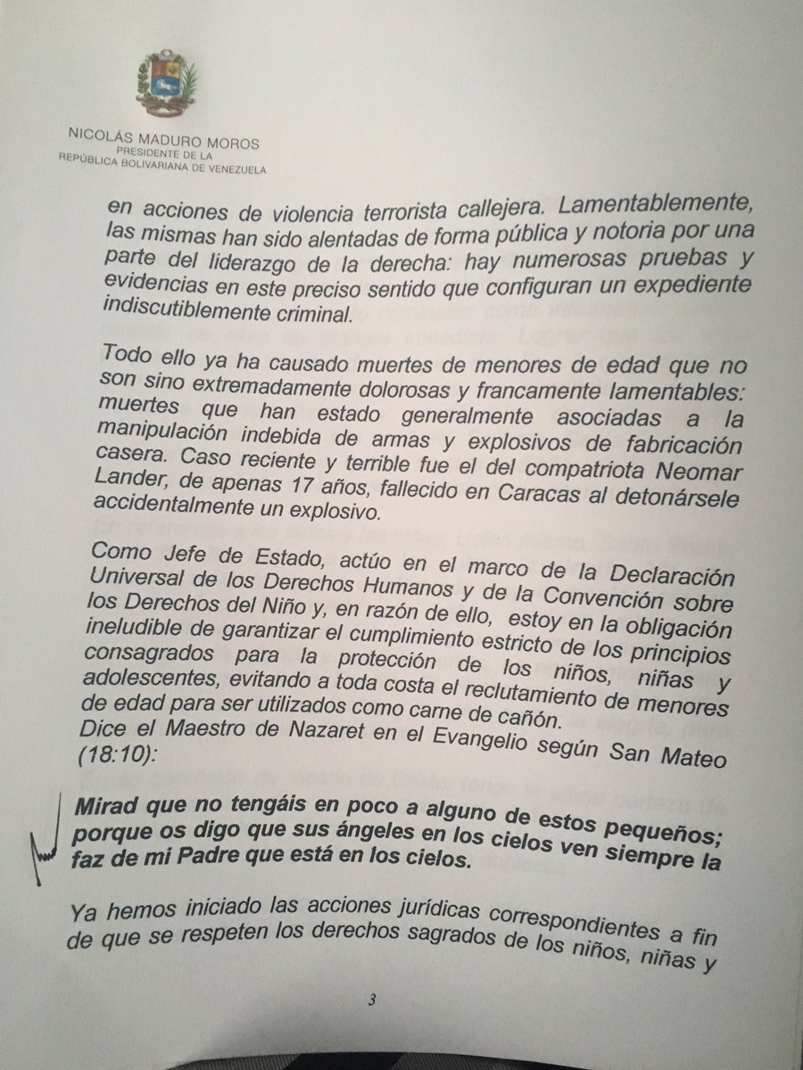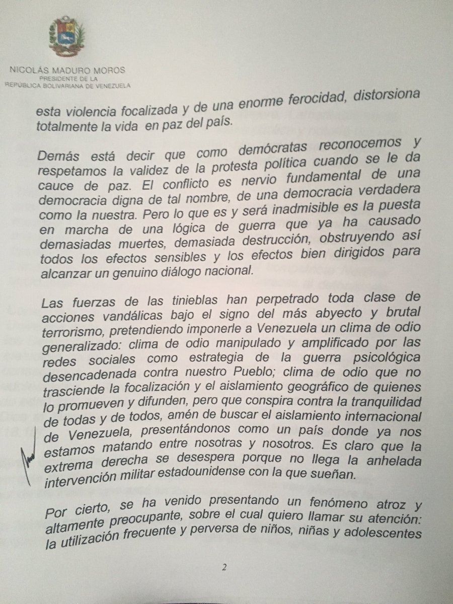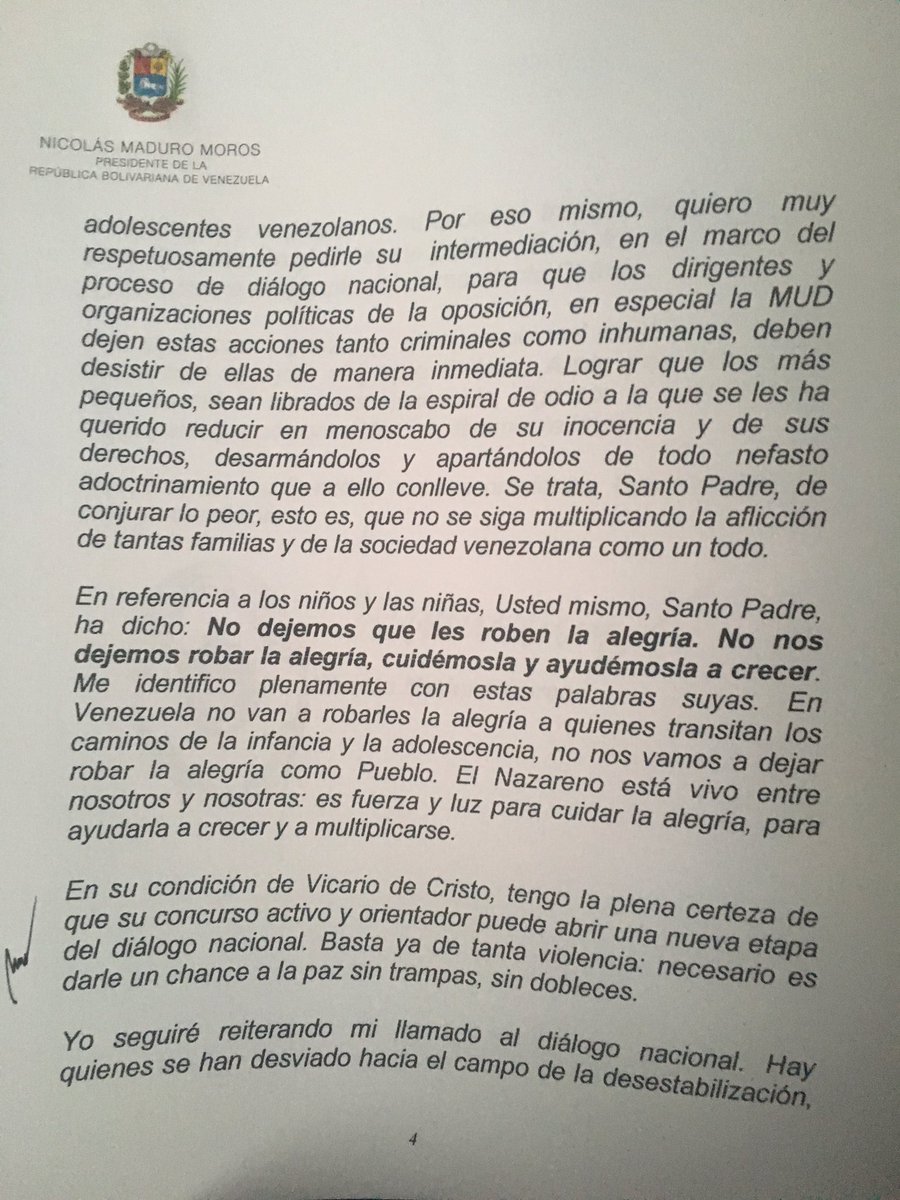 En la misiva, el primer mandatario nacional le pide al Sumo Pontífice su apoyo para que la oposición venezolana no “use a niños en actos violentos”, una solicitud que, según dice, recoge el sentir de una mayoría que rechaza a quienes juegan la “carta de la violencia”.