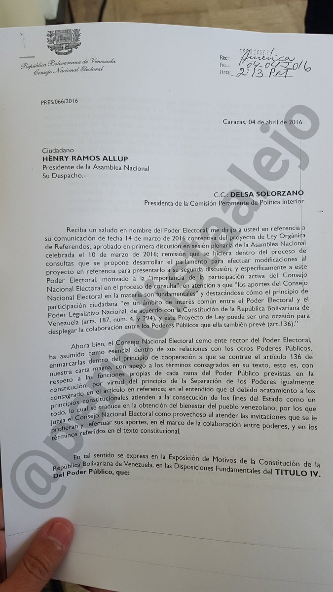 La presidente de la CNE, Tibisay Lucena, envió una carta al máximo representante de la AN, Henry Ramos Allup, en el que le advertía que solo el Poder Electoral era el único que podía “legislar” en materia electoral.
