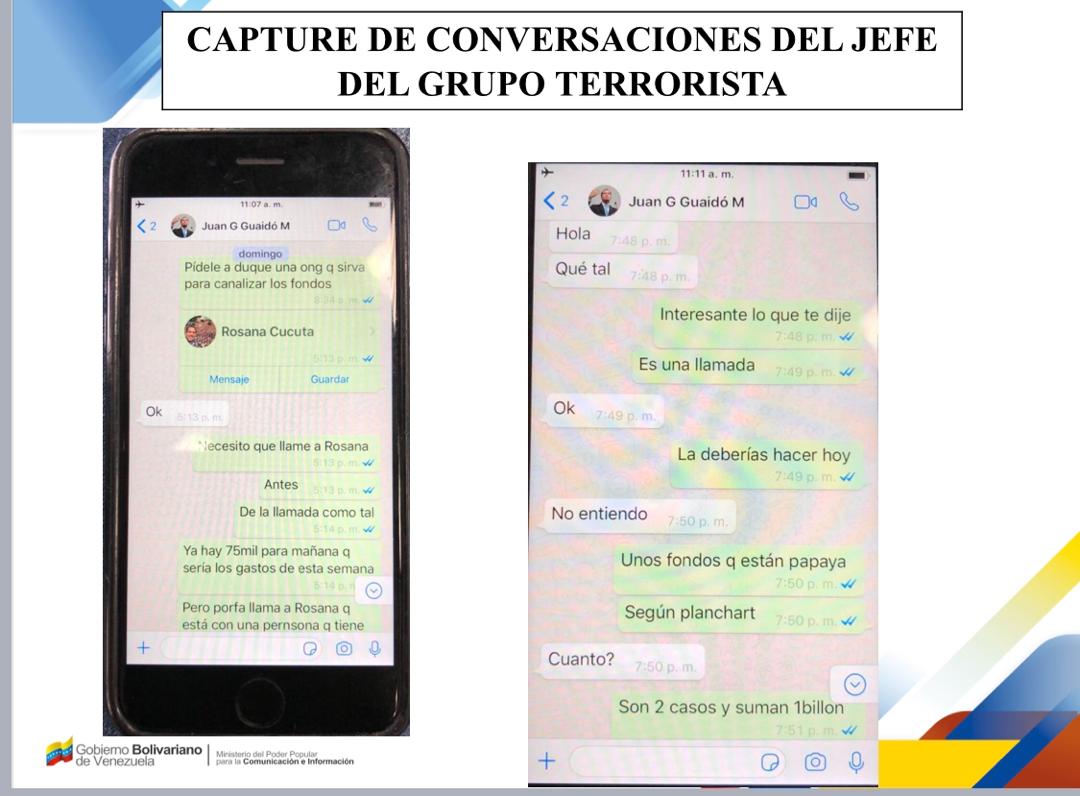 Dijo que Marrero estaría involucrado en el contrato de personas proveniente de Guatemala y Colombia para cumplir con el plan de reclutamiento y entrenamiento de sicarios. “Se le incautaron dinero, fusiles y una serie de teléfonos donde se ha encontrado muy importante evidencia (…) “Las conversaciones halladas en el teléfono de Marrero evidencian que conspira junto con Guaidó para gestionar financiamiento de actos terroristas”, indicó.