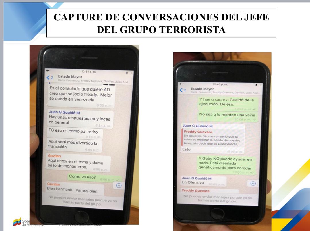 Asimismo, dijo que Marrero estaría involucrado en el contrato de dichas personas. “Se le incautaron dinero, fusiles y una serie de teléfonos donde se ha encontrado muy importante evidencia (…) “Las conversaciones halladas en el teléfono de Marrero evidencian que conspira junto con Guaidó para gestionar financiamiento de actos terroristas”, indicó.
