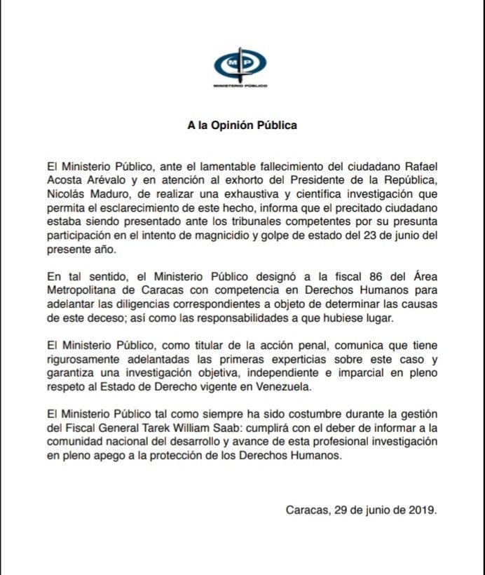 El Fiscal General de la República Tarek William Saab, ante el lamentable fallecimiento del ciudadano Rafael Acosta Arévalo, en nombre del Ministerio Público informa: pic.twitter.com/ugDGOqo5Tj