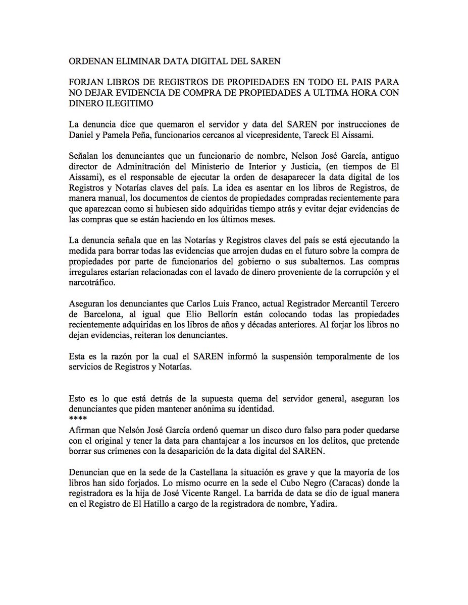 “Señalan los denunciantes que un funcionario de nombre, Nelsón José García, antiguo director de Administración del Ministerio de Interior, Justicia y Paz, es el responsable de ejecutar la orden de desaparecer la data digital de los registros y notarías claves del país. La idea es asentar en los libros de registros, de manera manual, los documentos de cientos de propiedades compradas recientemente para que aparezcan como si hubiesen sido adquiridos tiempo atrás y evitar dejar evidencias de las compras que se están haciendo en los últimos meses”, dijo.