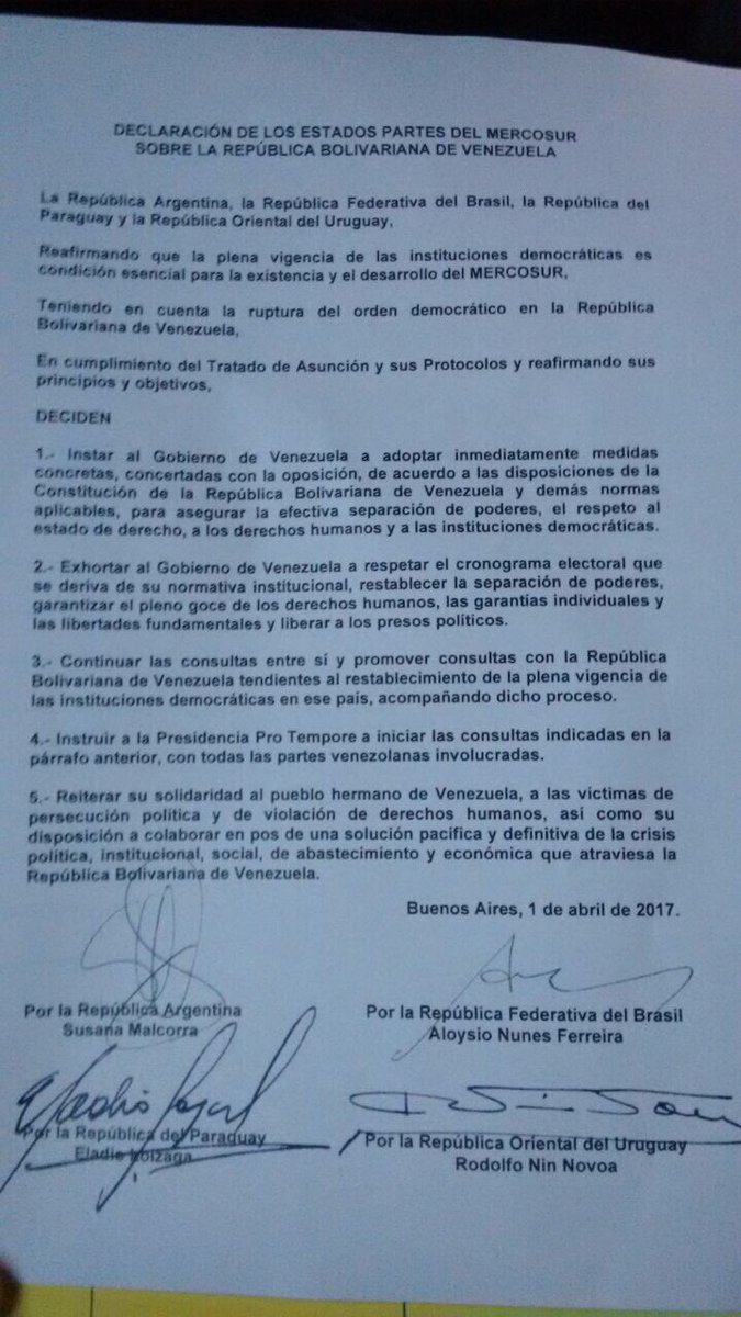 La canciller argentina Susana Malcorra anunció, junto a sus pares de Uruguay, Rodolfo Nin Novoa, de Brasil, Aloysio Nunes, y de Paraguay, Eladio Loizaga, que el Mercosur activó la cláusula democrática en Venezuela por «la falta de separación de poderes» bajo el régimen de Nicolás Maduro.