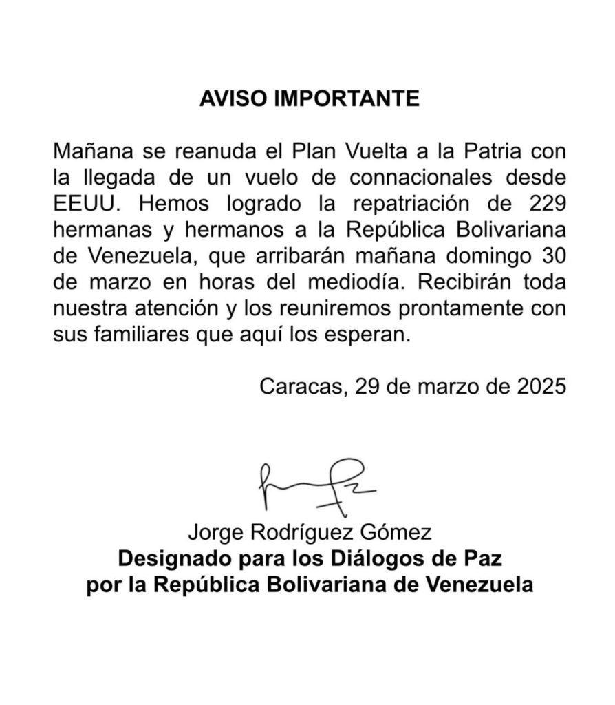 Este domingo 30 de marzo se reanudará el Plan Vuelta a la Patria con la llegada de un vuelo con 229 connacionales desde Estados Unidos (EE.UU.), así lo informó el presidente de la Asamblea Nacional (AN) y designado para los Diálogos de Paz para la República Bolivariana de Venezuela, Jorge Rodríguez, mediante un comunicado.