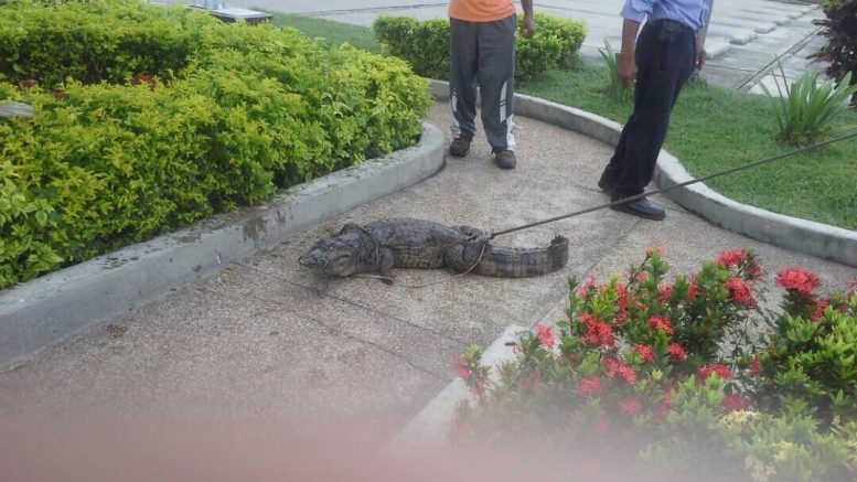 A través de las redes sociales, difundieron la fotografía de un caimán que apareció amarrado a las afueras de una tienda Farmatodo en Guarenas, estado Miranda.