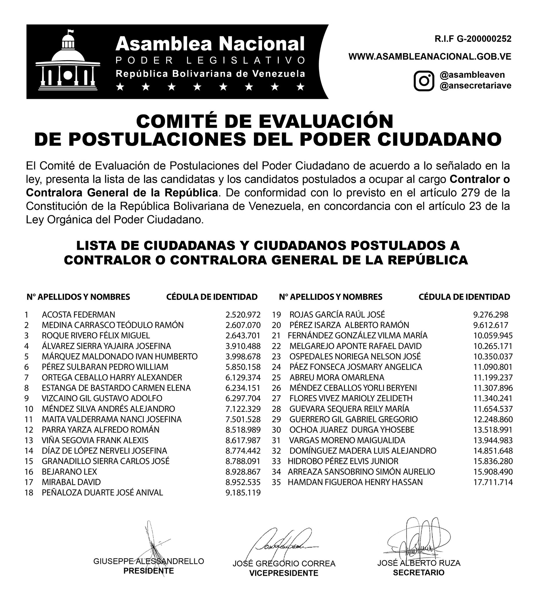 Por su parte, aparecen también 35 nombres para presidir la Contraloría General de la República. En este listado destacan la presencia de Elvis Junior Hidrobo Pérez, hijo del actual presidente del Consejo Nacional Electoral (CNE), Elvis Hidrobo Amoroso; así como el actual presidente del Saime Gustavo Vizcaíno.