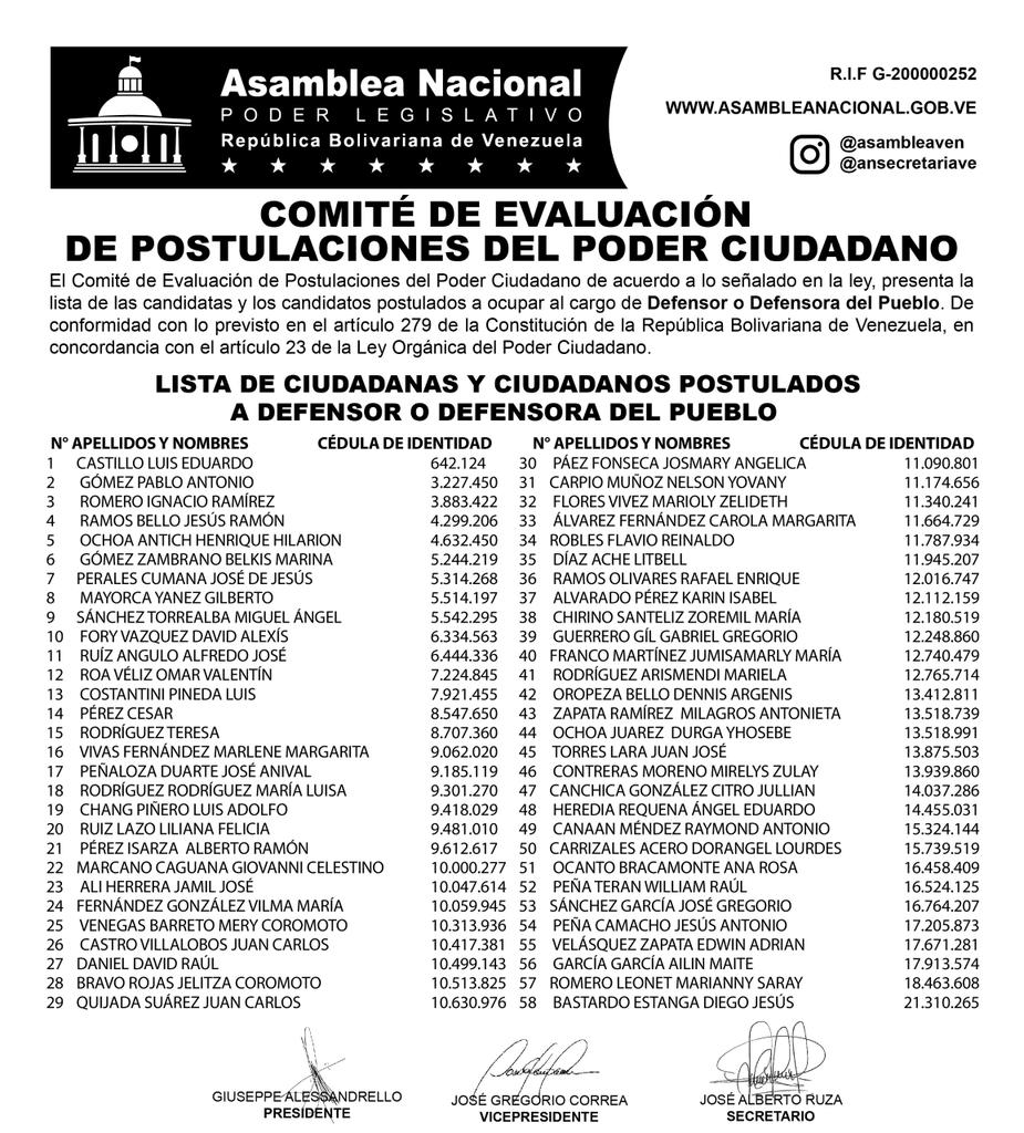 La Asamblea Nacional (AN), publicó este sábado el listado definitivo de los aspirantes a los tres cargos que conforman el Poder Ciudadano, por lo que se conoció que hay 118 postulados en total.
