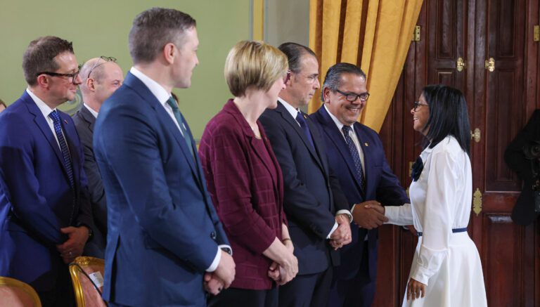 En el palacio presidencial de Miraflores, en Caracas, donde se celebró la firma del acuerdo, Rodríguez saludó especialmente al subsecretario y a los integrantes de su equipo, quienes se encontraban junto a la encargada de negocios de EE.UU. en el país suramericano, Laura Dogu.