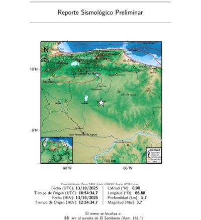 El epicentro del movimiento, ocurrido a las 12:54 hora local, se ubicó 58 kilómetros al sureste de El Sombrero, localidad ubicada en el estado Guárico y tuvo una profundidad de 5,7 kilómetros, de acuerdo al informe publicado por Funvisis en la red social X.