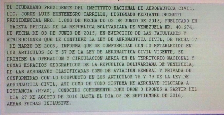 Dentro de las fechas mencionadas se encuentra el primero de septiembre, día en el cual la oposición saldrá a la “Toma de Caracas“. Una marcha pacífica contra los “atropellos por parte del Gobierno de Nicolás Maduro”, contra el pueblo venezolano. Esta medida, por parte del Inac, evitaría las tomas aéreas de las marchas tanto de medios de comunicación como de los ciudadanos en general.