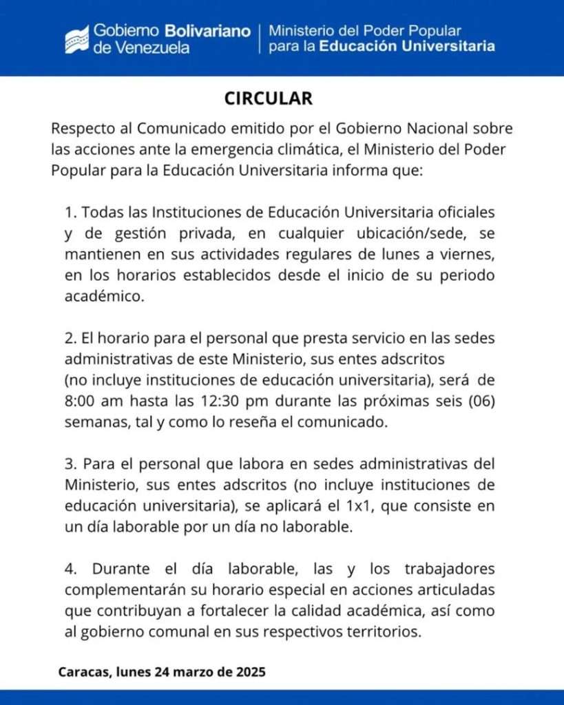La circular añade que el horario para el personal que presta servicio en las sedes administrativas de este Ministerio, sus entes adscritos (no incluye instituciones de educación universitaria), será de 8:00 am hasta las 12:30 pm durante las próximas seis (06) semanas, tal y como lo reseña el comunicado.