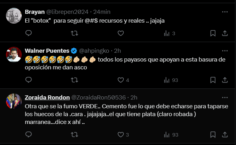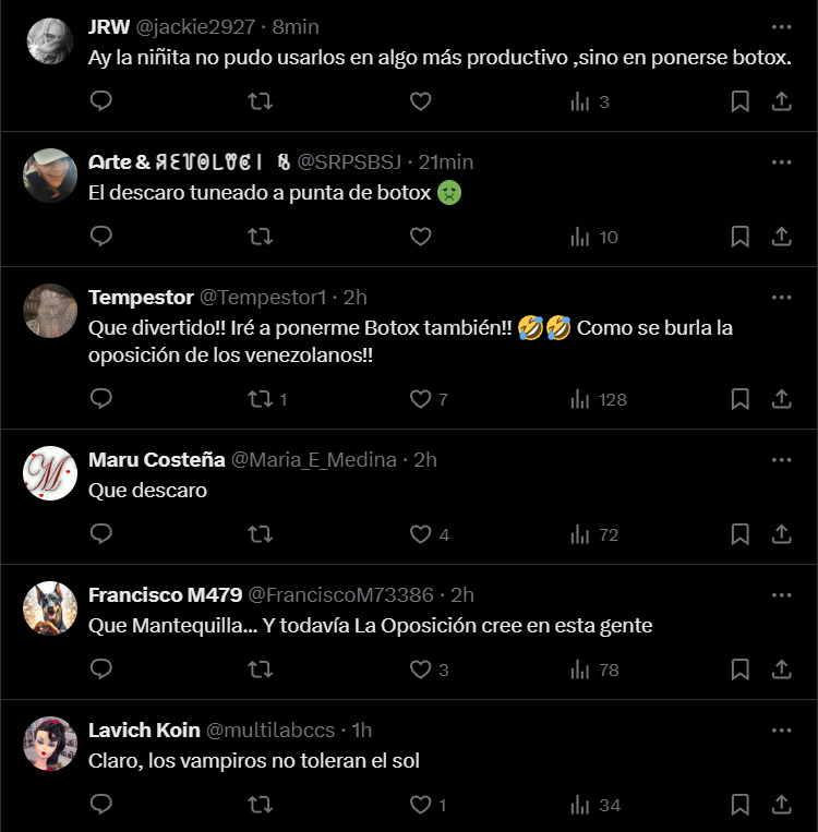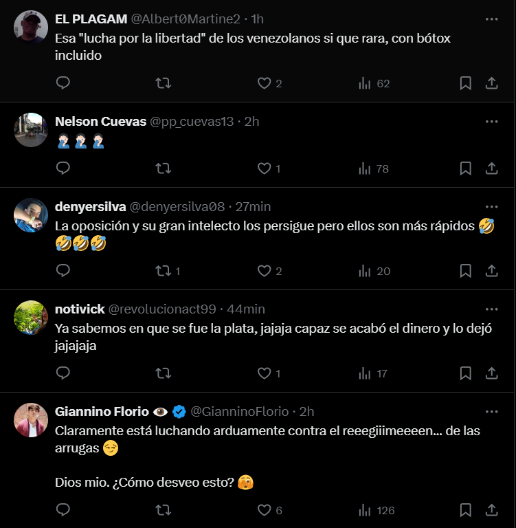 Usuarios en redes sociales expresaron su descontento con la publicación de Fabiana Rosales. «Esa lucha por la libertad de los venezolanos si que es rara, con botox incluido», expreso Alberto Martínez en X