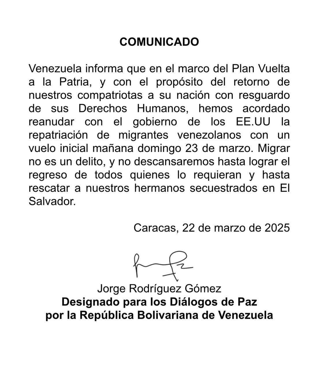 A través de un comunicado, el Designado para los Diálogos de Paz, Jorge Rodríguez, manifestó este sábado que a partir de mañana domingo 23 de marzo, se reanudarán los vuelos de repatriación de migrantes venezolanos desde Estados Unidos, en el marco del Plan Vuelta a la Patria, que impulsa el gobierno nacional para hacer justicia con la migración inducida.