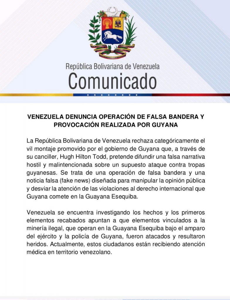 «La República Bolivariana de Venezuela rechaza categóricamente el vil montaje promovido por el gobierno de Guyana, que a través de su canciller, Hugh Hilton Todd, pretende difundir una falsa narrativa hostil y malintencionada sobre un supuesto ataque contra tropas guyanesas», dice el texto publicado por el canciller venezolano Yván Gil en su cuenta de Telegram.