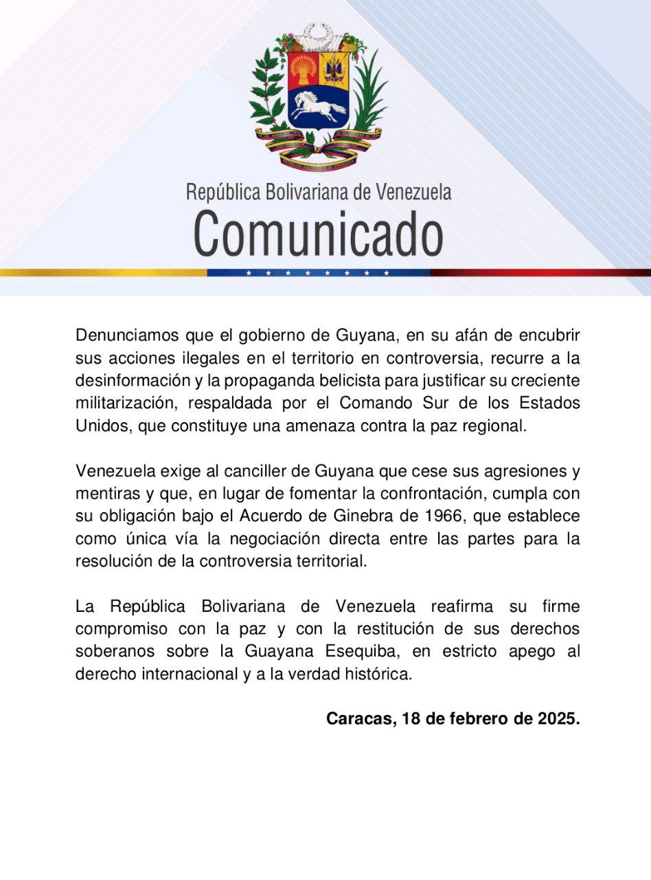 «La República Bolivariana de Venezuela reafirma su firme compromiso con la paz y la restitución de los derechos sobre la Guayana Esequiba, en estricto apego al derecho internacional y a la verdad histórica», culminó.