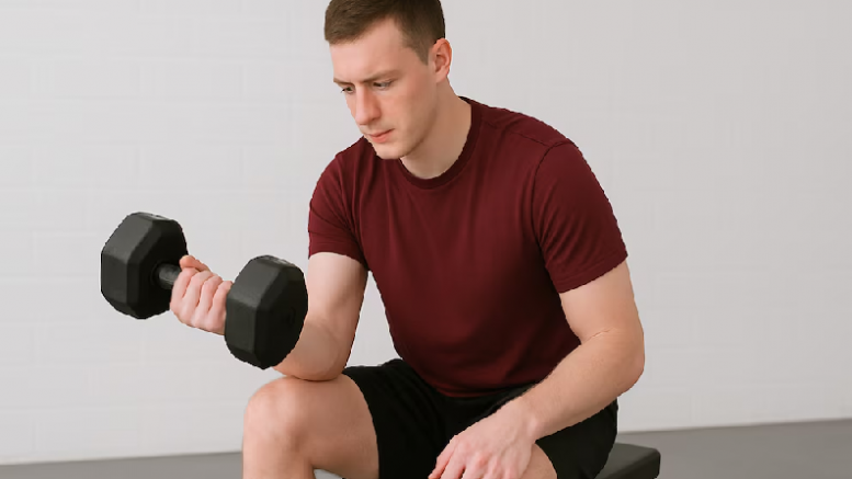 Las flexiones de muñeca, realizadas sentado con una mancuerna y apoyando el antebrazo en el muslo, permiten trabajar tanto la flexión como la extensión de la muñeca, ajustando el peso y las repeticiones según la variante.