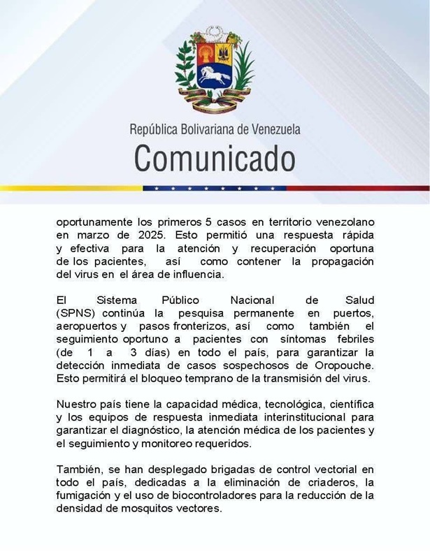 Como resultado de la vigilancia epidemiológica activa y sostenida para la detección del Virus de Oropouche desde 2023, año en que se confirmó la presencia de casos en la región en marzo de 2025 se han identificado los primeros cincos casos positivos de este virus en el país, de esta forma se detectó de forma rápida y efectiva la respuesta del Sistema Público Nacional de Salud (SPNS), informó el Gobierno de la República Bolivariana de Venezuela a través de un comunicado oficial.