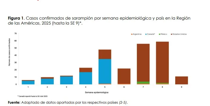 Como dato importante, destaca que en los datos mensuales de vigilancia de sarampión y rubéola, publicados por la OMS en 2025, hasta el 1 de febrero del 2025 se notificaron 7.633 casos sospechosos de sarampión, en 54 Estados Miembros de las seis regiones de la OMS, de los cuales 3.098 (40,6%) fueron confirmados.