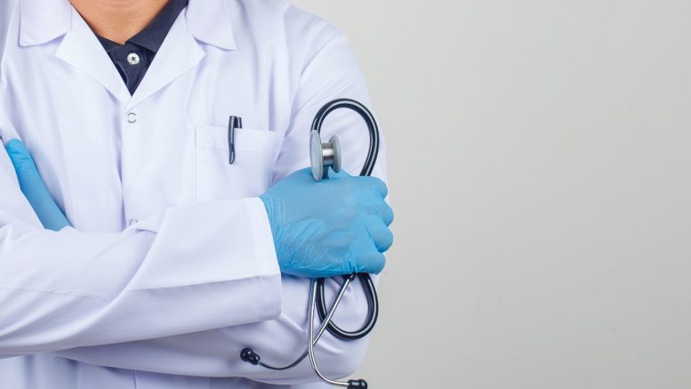 Doctor crossing arms while holding stethoscope in white coat front view.