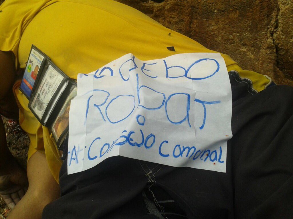 Con un letrero que dice "no debo robar al Consejo Comunal" encontraron 2 cadáveres en Guarenas pic.twitter.com/MzynCK8Jez