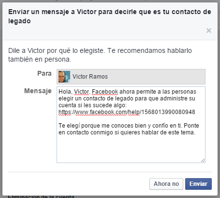 Al seleccionar la persona, el sistema da la posibilidad de enviarle en ese momento un mensaje para explicarle por qué ha sido elegida y una breve explicación de lo que es un contacto de legado.