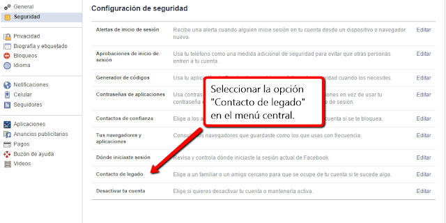 Una vez seleccionado esa opción se abrirá un menú en el centro de la pantalla. Debemos buscar casi al final la opción Contacto de legado y hacer click.