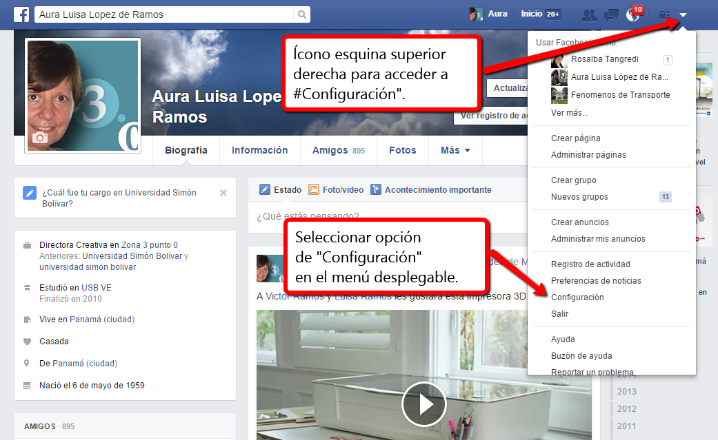Para comenzar, debemos acceder al menú de configuración de Facebook, eso lo podemos hacer desde el menú de la esquina superior derecha desde nuestra cuenta, que es un icono en forma de punta de flecha descendiente.