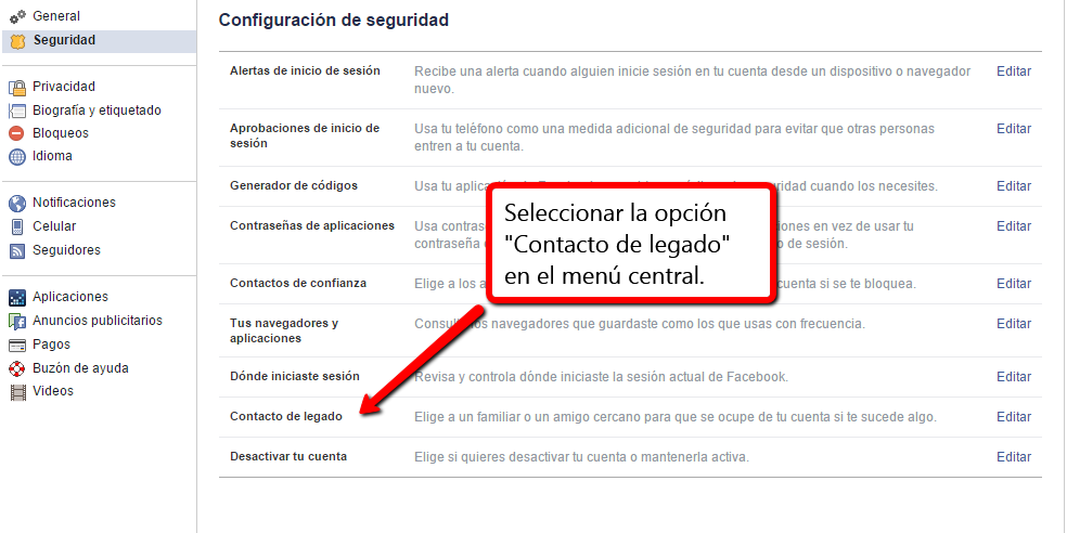 Una vez seleccionado esa opción se abrirá un menú en el centro de la pantalla. Debemos buscar casi al final la opción Contacto de legado y hacer click.