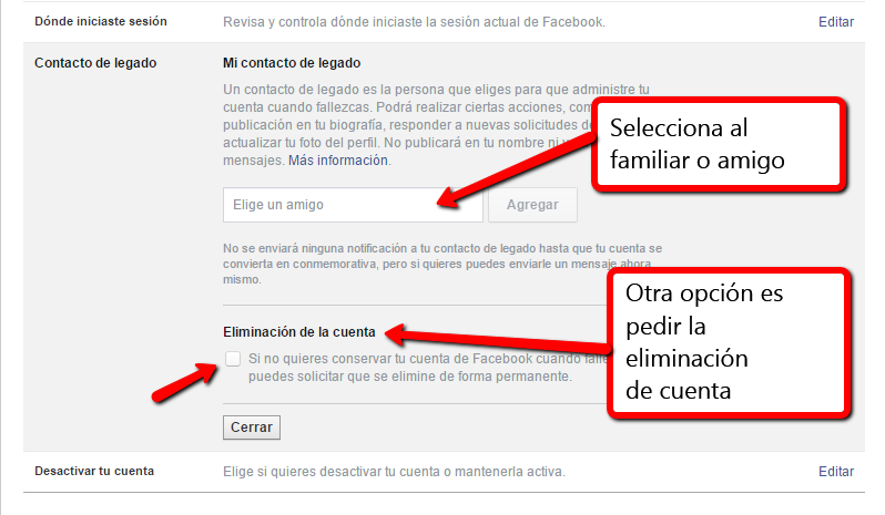 Aparecerán dos opciones. La primera es Mi contacto de legado, junto con una breve explicación de qué es y qué se puede hacer con el perfil. Justo debajo, está el formulario para seleccionarlo de entre la lista de amigos de Facebook. La segunda opción es la Eliminación de cuenta, en el caso de que no querer conservar nuestra cuenta cuando pasemos a mejor vida.
